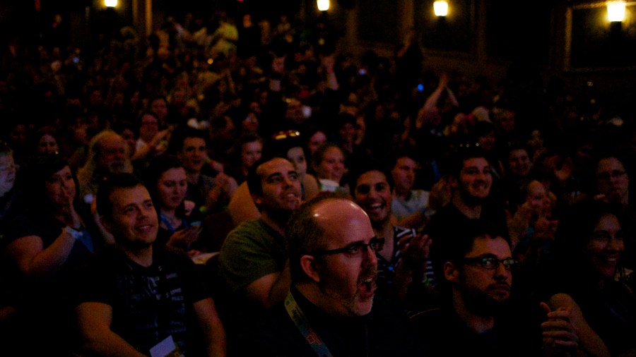 The crowd cheers in the theatre